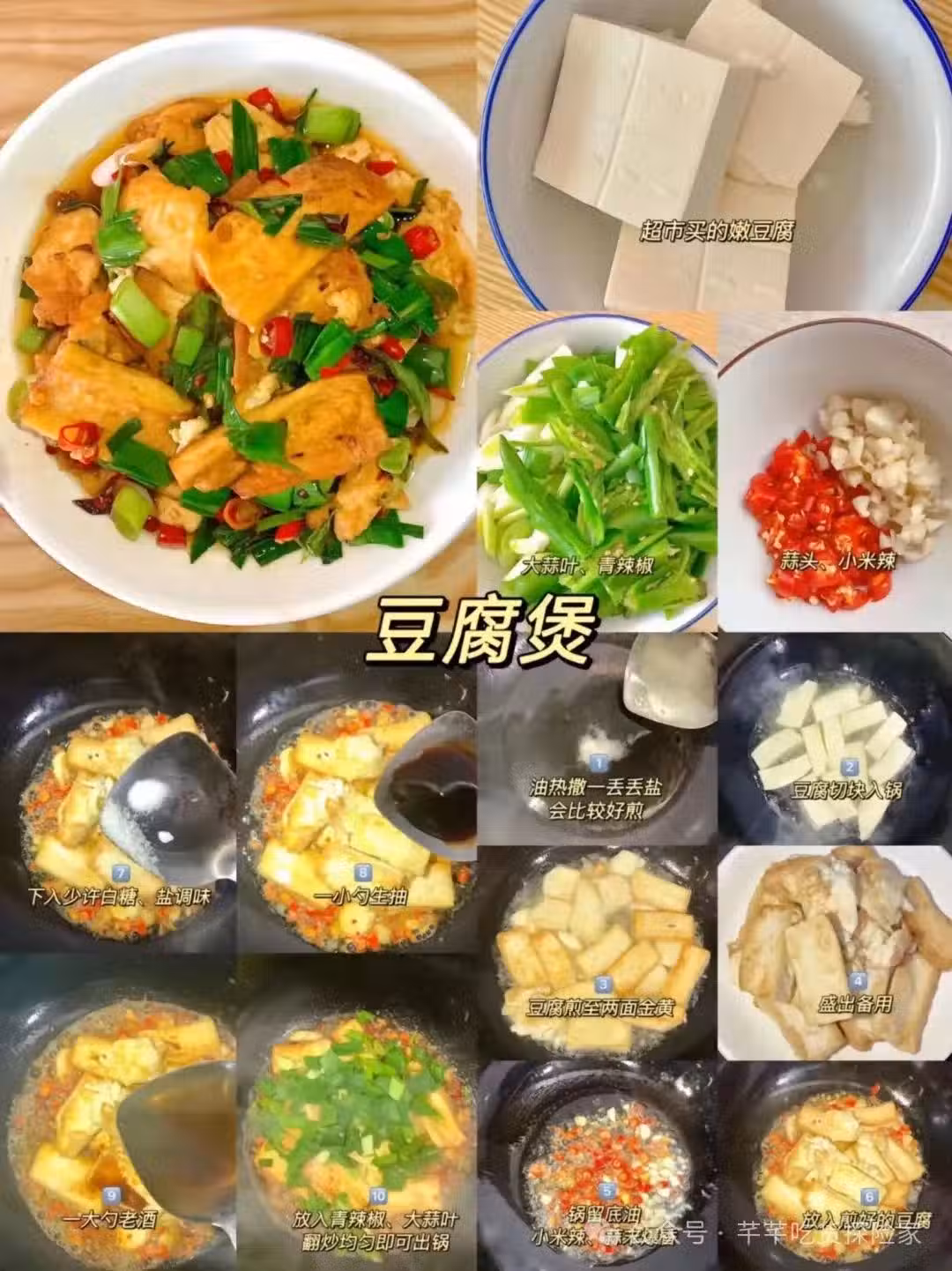 準備食材:豆腐,蒜苗,青辣椒,蒜,小米辣,生抽,老抽(圖片文字錯誤),鹽,白糖。