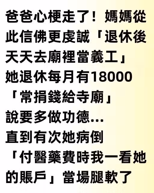 爸爸心梗走了!媽媽從此信佛更虔誠「天天去廟裡當義工」,她退休每月有18000「常捐錢給寺廟」說要多做功德… 直到有次她病倒「付醫藥費時我一看她的帳戶」當場腿軟了