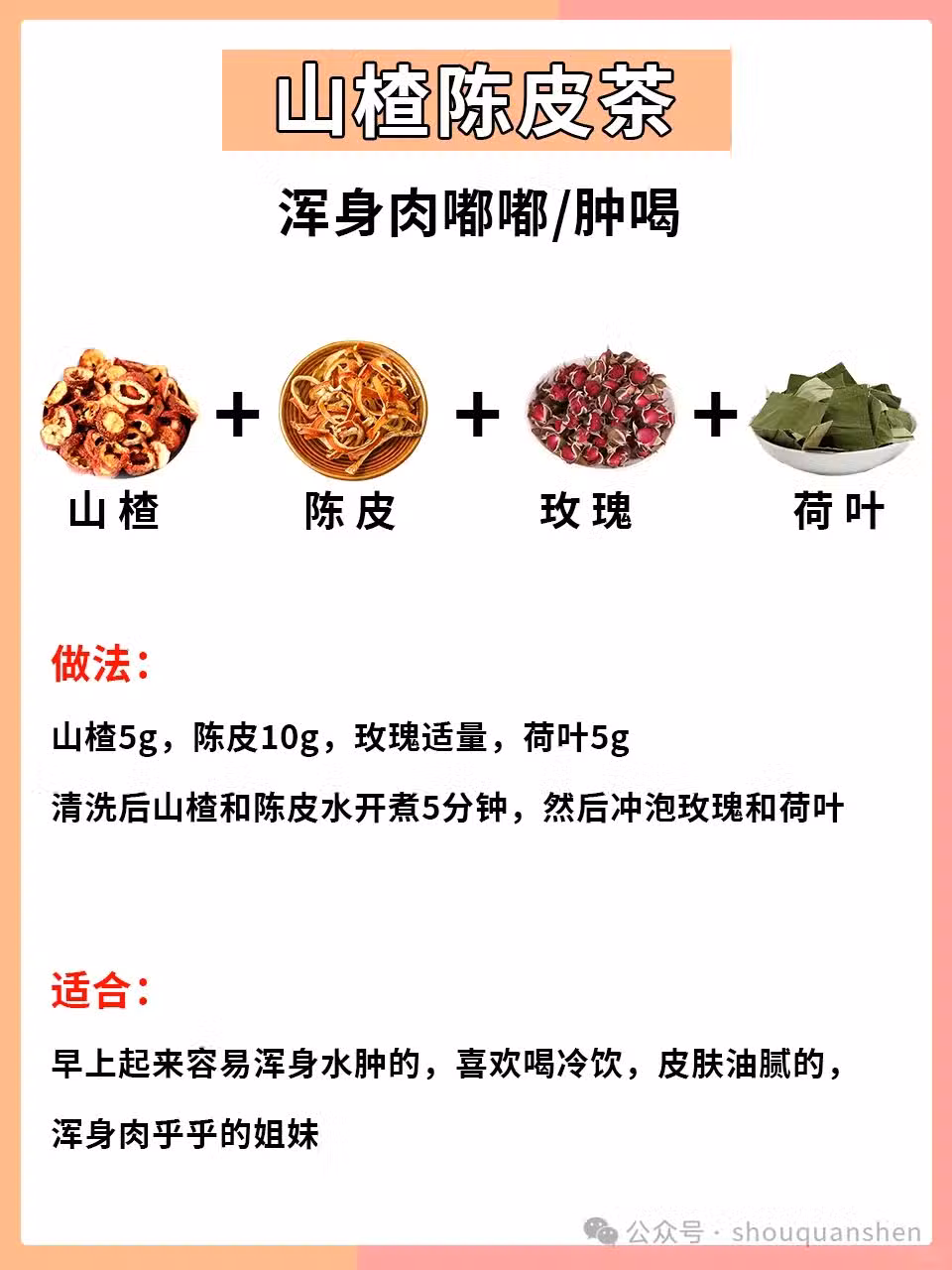 🍊 山楂 + 陳皮:陳皮可以促進氣血流通,山楂則幫助消脂,二者結合雙效作用,既能去水腫,又能消除脂肪,幫你恢復緊緻身材!