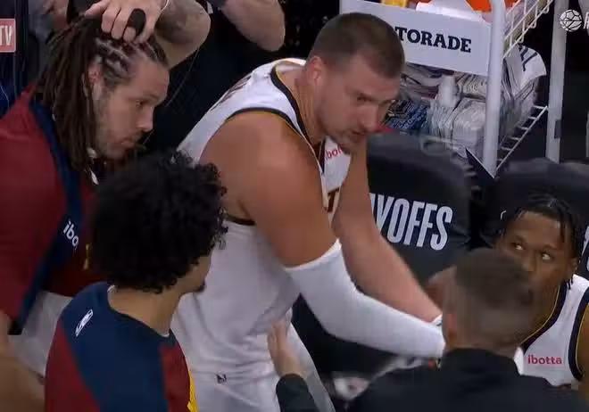 而在比賽過程當中,約基奇終於已經忍無可忍,失控了,他在隊友出現了一個非常離譜低級的失誤之後,直接選擇了給隊友鼓掌嘲諷,這是確實受不了了。當時比賽第4節最後時刻,已經沒有了所謂的勝負懸念,掘金隊派上了他們的飲水機球員泰森。