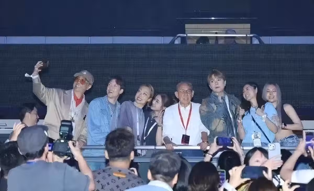 開場前一個小時,「英皇大部隊」便接連進場,容祖兒、蔡卓妍、關智斌、歐陽震華、張敬軒等人都參加了這次應援,三十多位英皇藝人站在一起拍合照的場面簡直不要太壯觀。