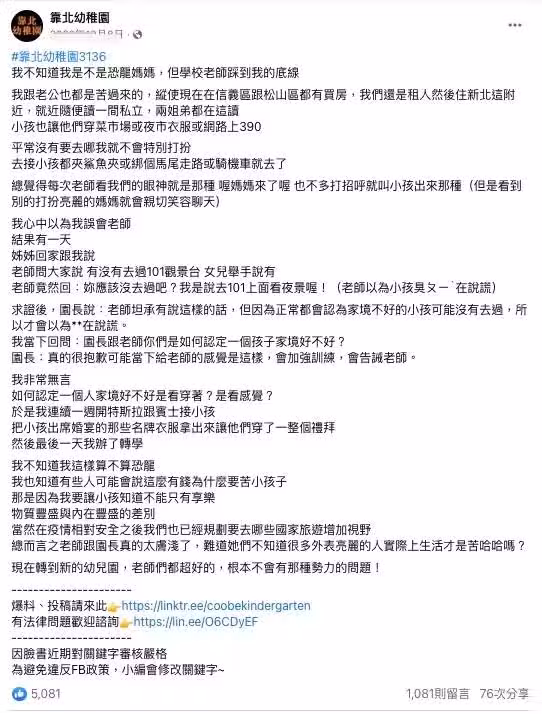 PO文曝光後立刻引來數千名家長盛讚:「老師視野太低了,很多有錢人不開奔馳」、「這種有特異差別眼光的老師才該檢討,就算真的家境清寒,也不應該對孩子的受教權有差別待遇」、「有這種老師,教出來的也絕對不會是尊敬她這個老師的學生!」除此之外還釣出育有三子女的男星黃鐙輝妻子其萁回應:「瓜張了,我家肯定也被這老師看不起,我家都買100元衣服。」