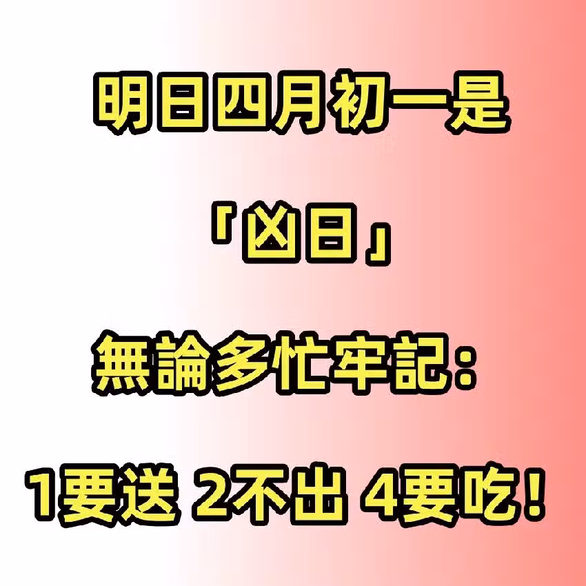 🚨 明日四月初一是「凶日」!無論多忙,都一定要記住:1要送、2不出、4要吃!