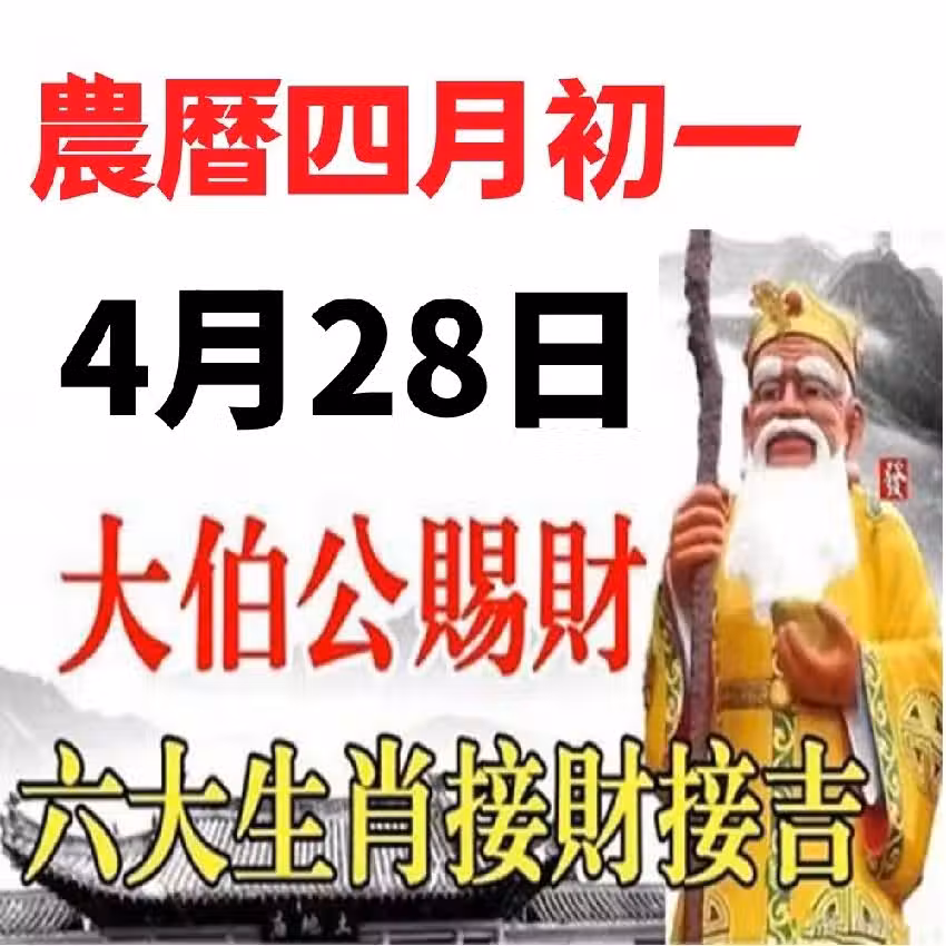 農暦四月初一(4月28日)大伯公賜財,六大生肖接財接吉!