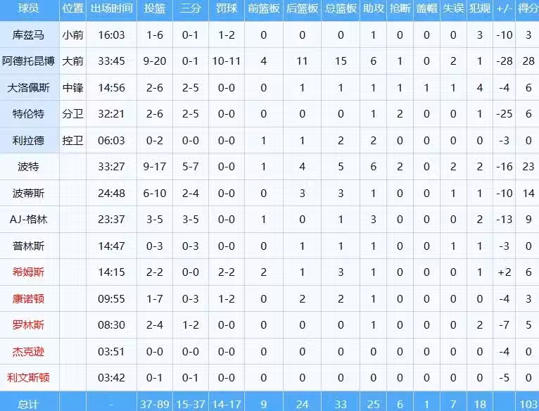 替字母哥心塞的一天,首發陣容除了他竟然無一人得分上雙,首發前鋒庫茲馬繼G1得分掛零後,G4隻有3分進帳......此時不提桶跑路,更待何時?