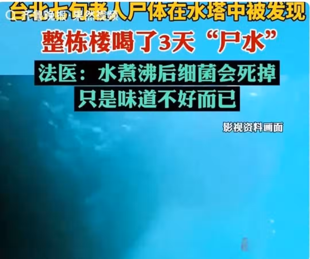 對於喝了「屍水」有沒有危害這個問題,法醫出來解釋了:「把一塊肉泡在水裡,像現在這種天氣,一天就壞掉了,會產生很多細菌。但這些細菌經過高溫煮沸就會死掉,喝了煮過的水,頂多就是味道不好而已,不會有太大問題。」 可即便法醫這麼說,住戶們心裡還是過不去這個坎兒。