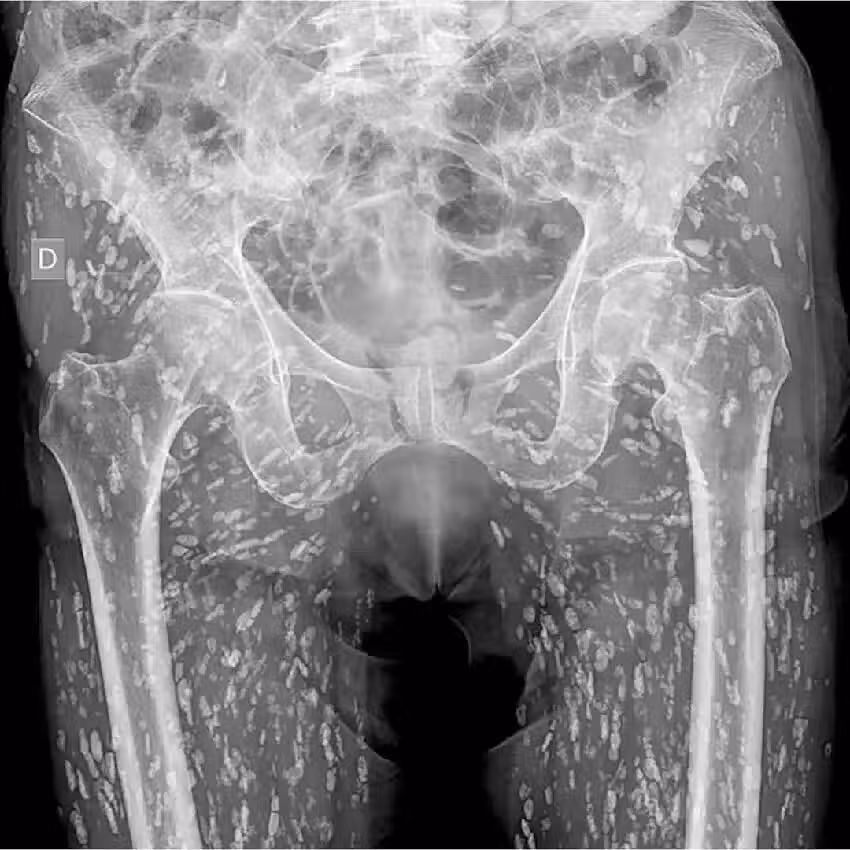 根據媒體《Khaosod》的報導,一名泰國網友「Ai Jaeo Mueang Chan」在臉書分享,自己過去在擔任X光助理時,一名婦人到診所拍攝從髖部到腿部的X光,結果影像一出來布滿詭異陰影,放射科醫師一看,指出這些白點其實全是寄生蟲!他直言,當時的畫面就像下圖: