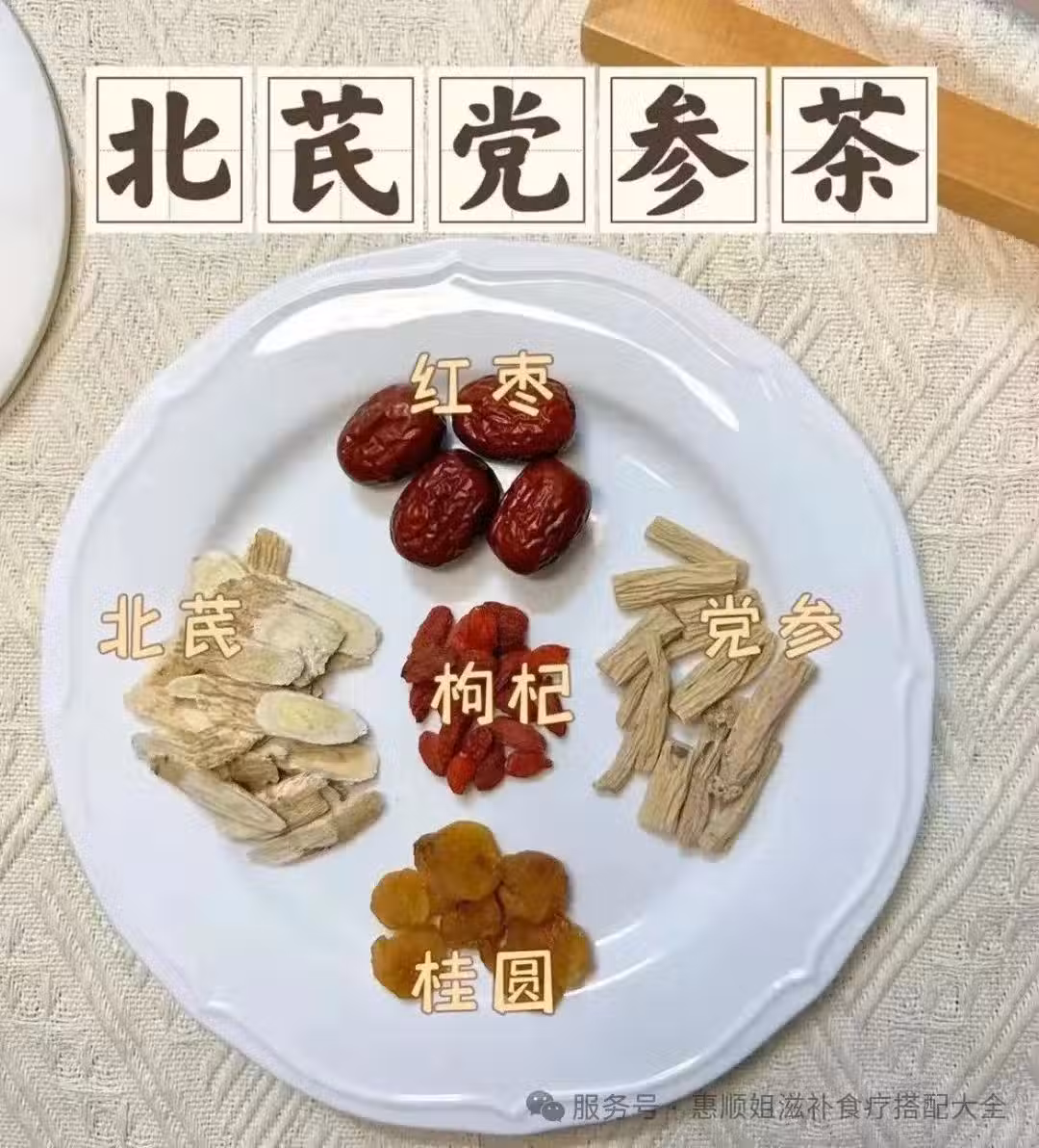 食材:黨參10克、北芪10克、紅棗3顆、枸杞10克、桂圓5顆