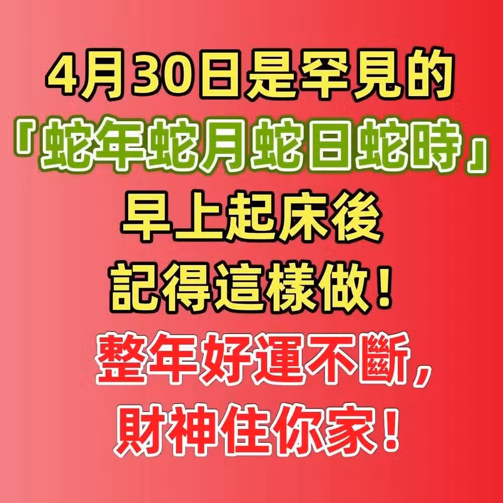 4月30日是罕見的「蛇年蛇月蛇日蛇時」早上起床後記得這樣做!整年好運不斷、財神住你家!