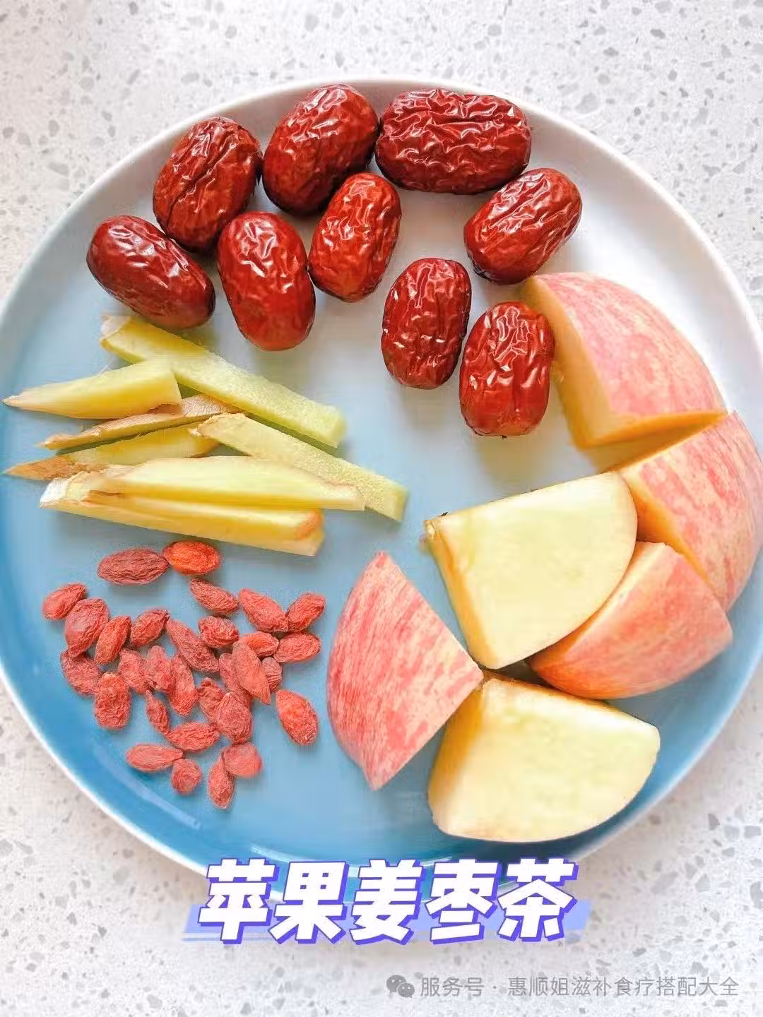🍎蘋果半個+大棗6-7顆(去核)+姜2-3片(切絲)+枸杞6-7顆,煮水或開水沖泡。適合女性月經期間飲用,暖胃祛寒、活血化瘀。👩‍🎨
