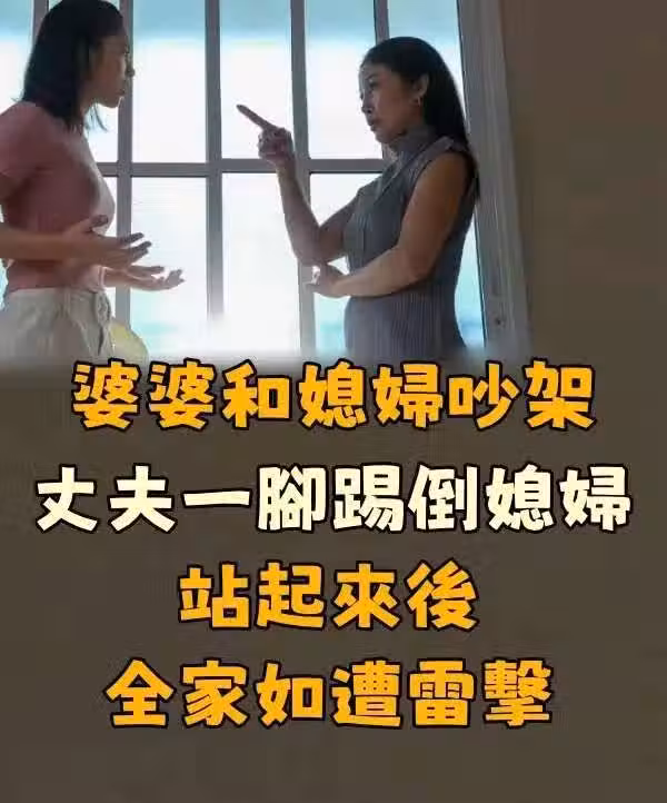 婆婆和媳婦吵架,丈夫一腳踢倒媳婦,站起來後,全家如遭雷擊.