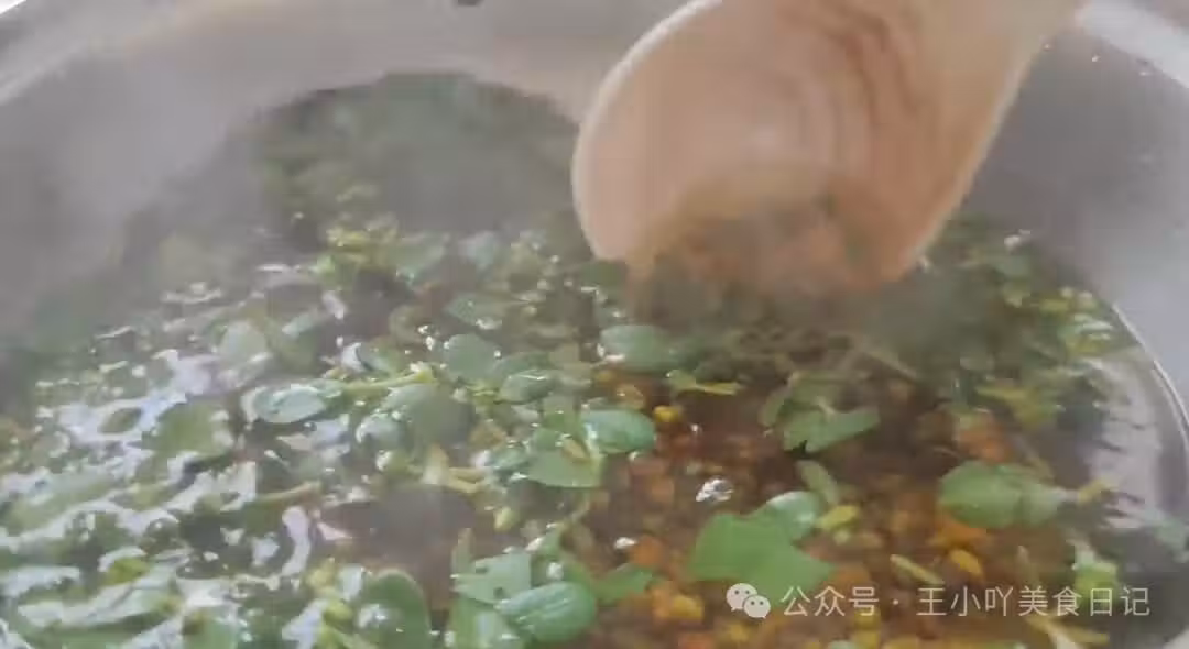 加入馬齒莧煮制:這時候鍋里的綠豆也已經煮好了,將準備好的馬齒莧倒入鍋中。用勺子將馬齒莧和綠豆攪拌均勻,讓它們充分混合在一起。然後繼續用小火煮 5 分鐘,讓馬齒莧的營養充分融入湯中。在煮的過程中,同樣可以適時攪拌一下,使食材受熱均勻。