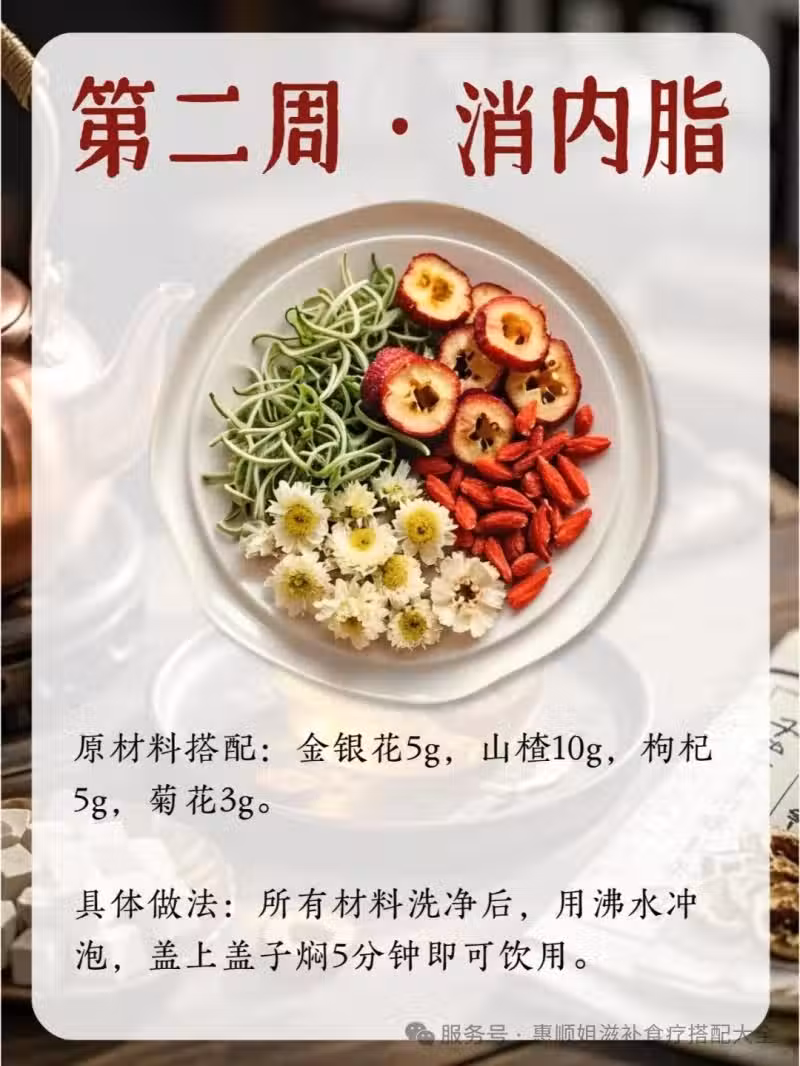 金銀花清熱解毒,山楂降脂,枸杞養肝明目,菊花清火,四者結合,內脂悄悄消。