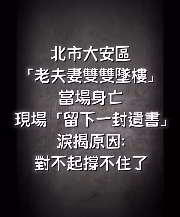快訊/北市大安區「老夫妻雙雙墜樓」當場身亡 現場「留下一封遺書...」淚揭原因:對不起撐不住了