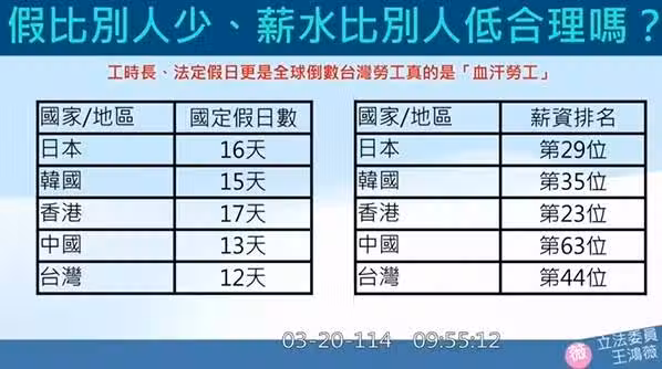 立法院內政委員會日前排案《紀念日及節日實施法草案》審查時,外界關注是否增加國定假日,但內政部長劉世芳則認為不宜倉促修法。國民黨立委王鴻薇20日在立法院司法及法制委員會進行業務報告及備質詢時說,台灣與日本、韓國與香港等鄰近國家相比,國定假日台灣最少只有12天,最多是香港17天,按薪資排序則是第44位,僅高於中國,均低於日韓。因此,還假於民得到很多民眾支持詢問。