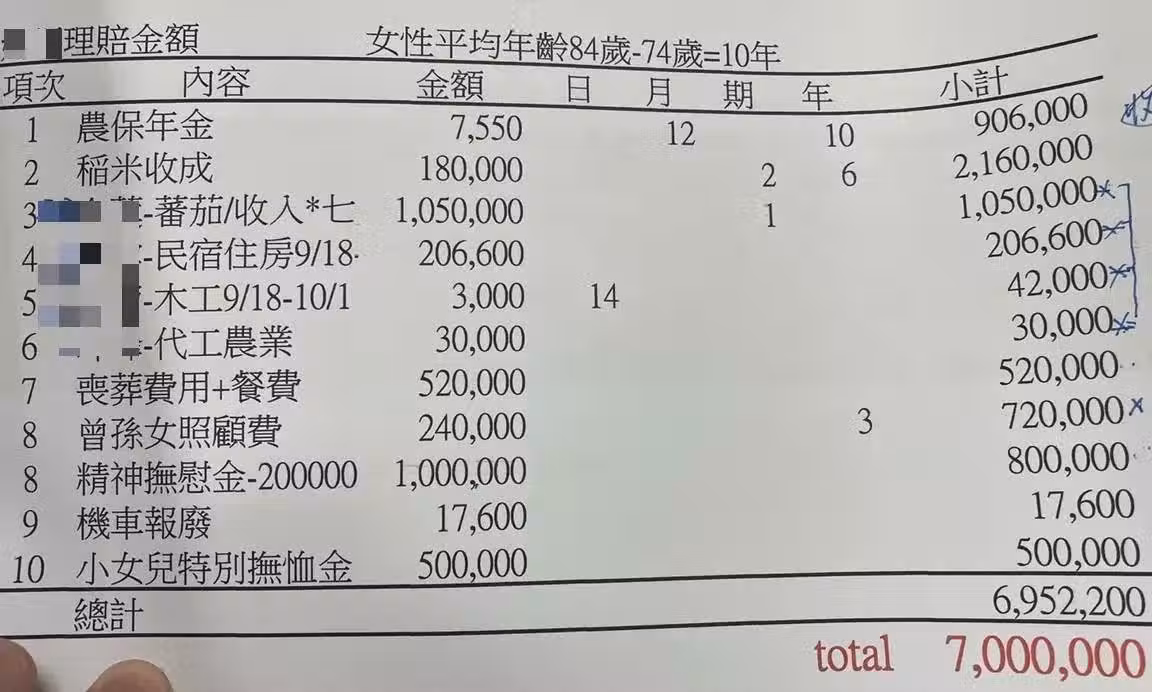 不過駕駛無奈表示,自己沒有酒駕、沒有任何違規,事發後也5度到家屬面前下跪道歉,但是對方卻無法接受,堅持要喊告,後來警方移送調查後,因為他沒有違規,目前律師判斷檢察官應該會給予不起訴處分,只剩下民事賠償部分,然而包括稻米收成、喪葬費、小女兒特別撫恤金及醫療看護與精神撫慰等,全部加起來居然要1096萬元。
