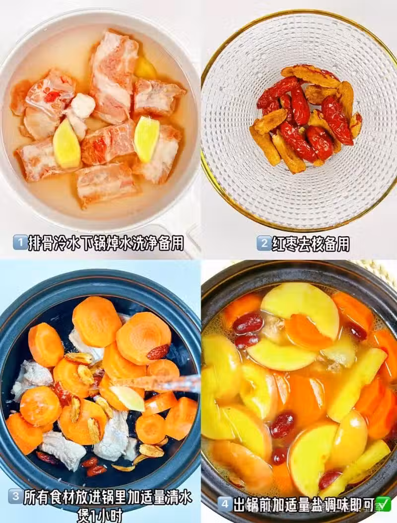 📖食材 蘋果1個、胡蘿蔔1根(選紅胡蘿蔔)、排骨300克、紅棗、薑片3片、鹽少許
