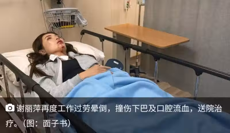 謝麗萍再度工作過勞暈倒,撞傷下巴及口腔流血,送院治療。(圖:面子書)