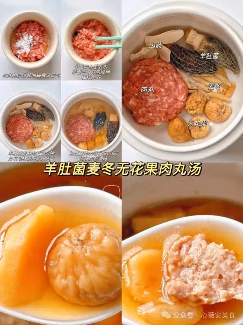 羊肚菌、麥冬與無花果的組合,堪稱天作之合。麥冬,如同一位溫柔的守護者,具有滋陰潤肺、益胃生津的功效,為湯品增添了一份溫潤的滋養。羊肚菌和無花果則繼續發揮它們提鮮與健脾的優勢,三者相輔相成。再加入肉丸,讓湯的營養更加均衡全面。這碗湯,就像是為孩子量身定製的成長護盾,幫助孩子更好地適應春季多變的氣候,在成長的道路上穩步前行。