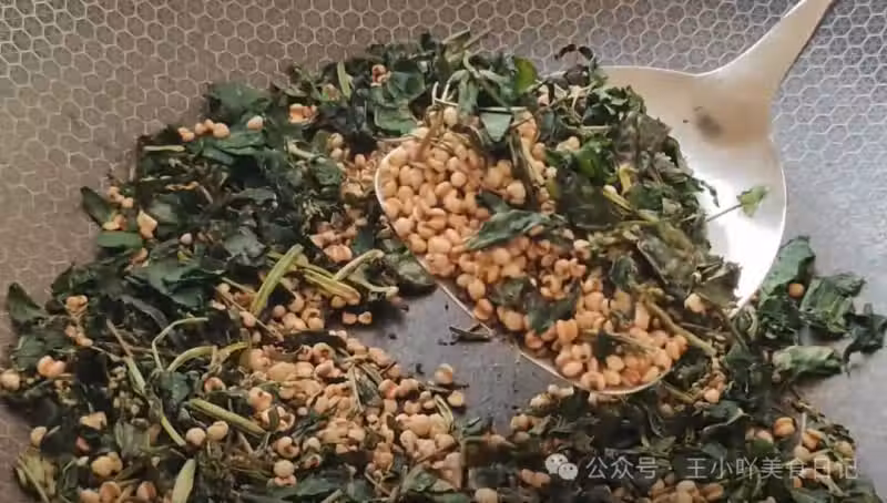 在翻炒過程中,要密切關注食材的狀態,整個過程車前草會逐漸斷青變軟,顏色也會慢慢變干發黑。全程大約需要 20 分鐘,炒得越干,保存的時間就越長。當炒到像視頻中展示的那樣,食材變得乾燥、色澤均勻時,就可以關火出鍋了。將炒好的車前草薏米放入盤中攤開晾涼。