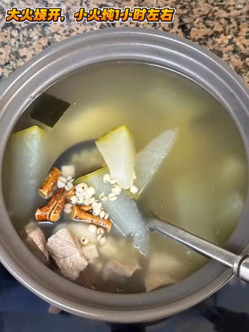 - 放入冬瓜塊,繼續小火燉30分鐘,至食材軟爛;