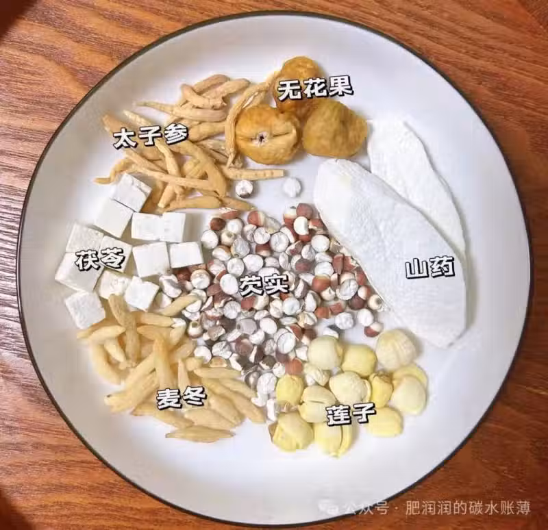 食材:太子參5g、山藥10g、蓮子10g、茯苓10g、芡實10g、麥冬10g、無花果3顆