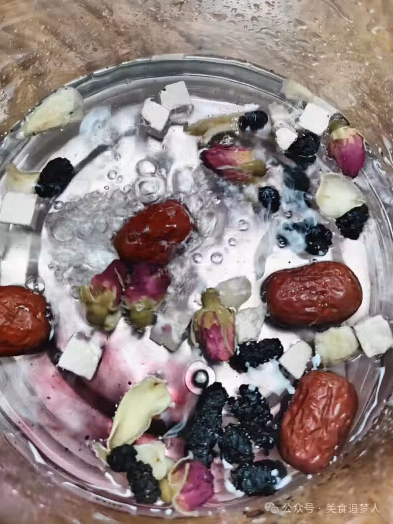 食材:玫瑰6g、桑葚3g、百合5g、茯苓5g、紅棗2-4顆