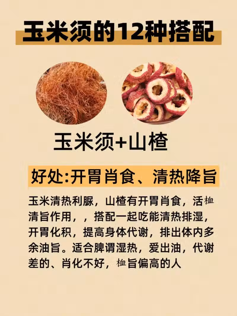 1. 玉米須+山楂:15克玉米須搭配10克山楂,消食降脂,促消化 。
