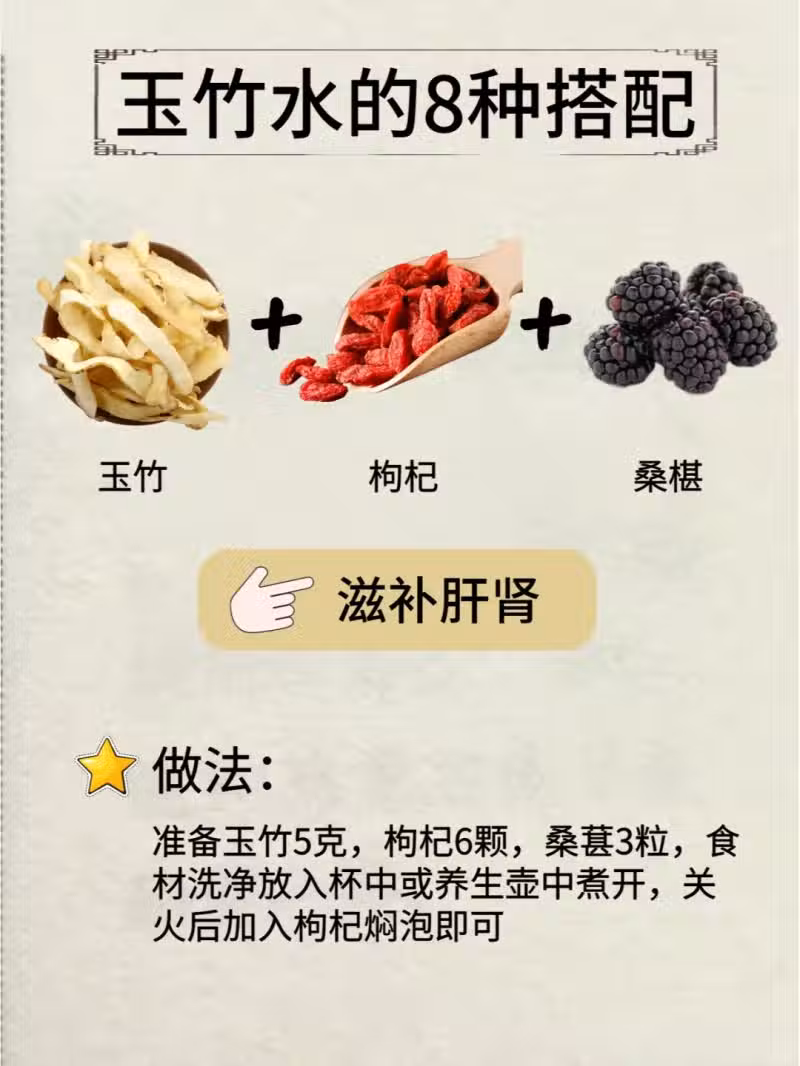 4. 玉竹+枸杞+桑椹:深度滋養肝腎,頭髮烏黑濃密,精神頭十足 。