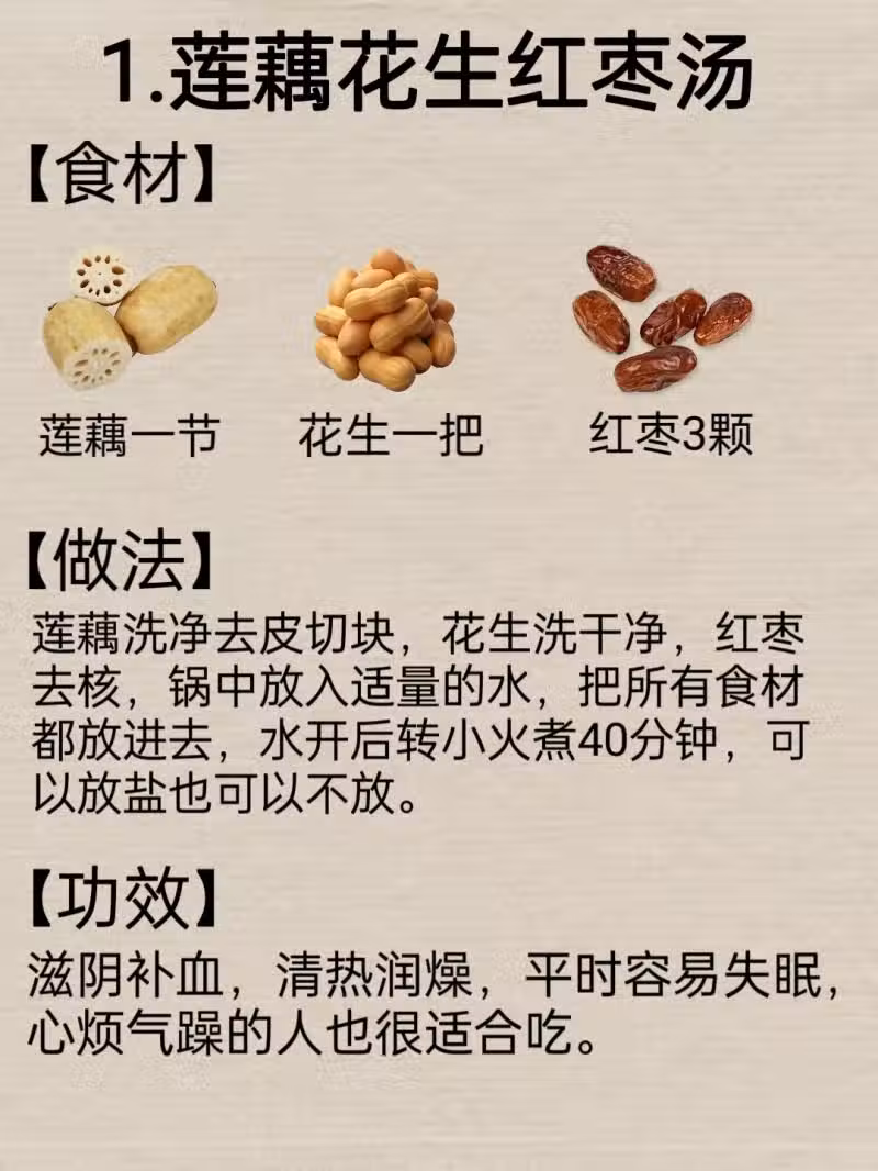 1.蓮藕花生紅棗湯 滋陰補血,清熱潤燥,平時容易失眠,心煩氣躁的人也很適合喝。