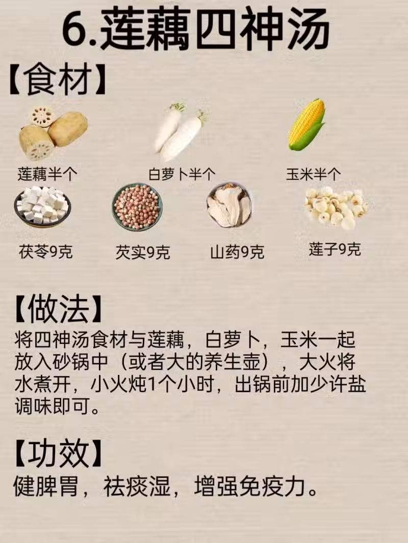 6.蓮藕四神湯 這道湯可以健脾胃,祛痰濕,增強免疫力。
