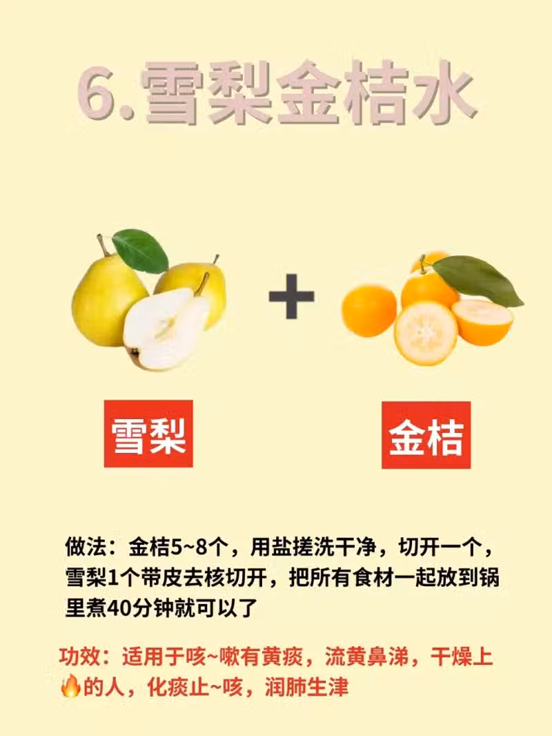 6.雪梨金桔水:適用咳~嗽有黃痰,流黃鼻涕,乾燥上🔥的人,化痰止~咳,潤肺生津