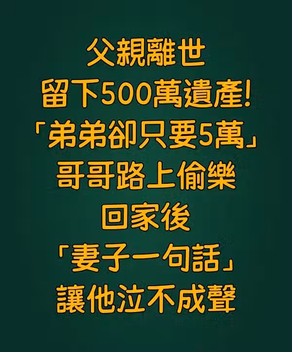 父親離世留下500萬遺產!「弟弟卻只要5萬...」哥哥路上偷樂 回家後「妻子一句話」讓他泣不成聲