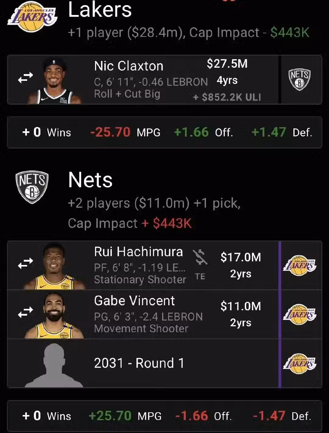 具體為,湖人送出八村壘、文森特、2031年首輪簽,得到克拉克斯頓。