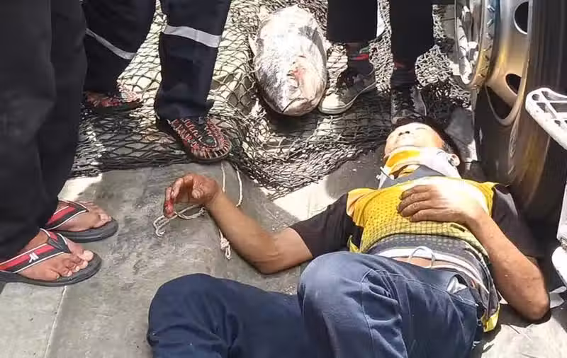 (曼谷12日綜合電)泰國北欖府近日發生一單離奇倒霉事件,一名司機中午開車到碼頭接貨,來到現場後將車子停靠在一艘裝滿大量急凍鮪魚的貨輪旁邊,然後下車伸個懶腰,沒想到突然天降一尾40公斤的急凍鮪魚,將他擊倒地、頭破血流,荒唐畫面也嚇傻附近路人!