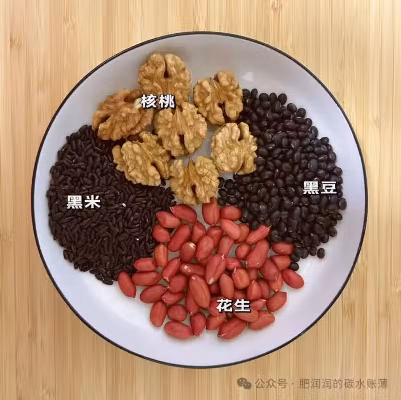 食材:核桃30g,花生30g,黑米I5g,黑豆20g