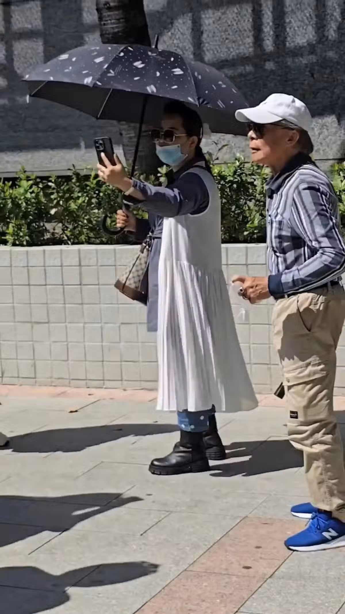 何伯何太對抗外人時依舊合拍,網民質疑離婚消息的真實性。何太在旁邊用電話拍片。-------------------------
