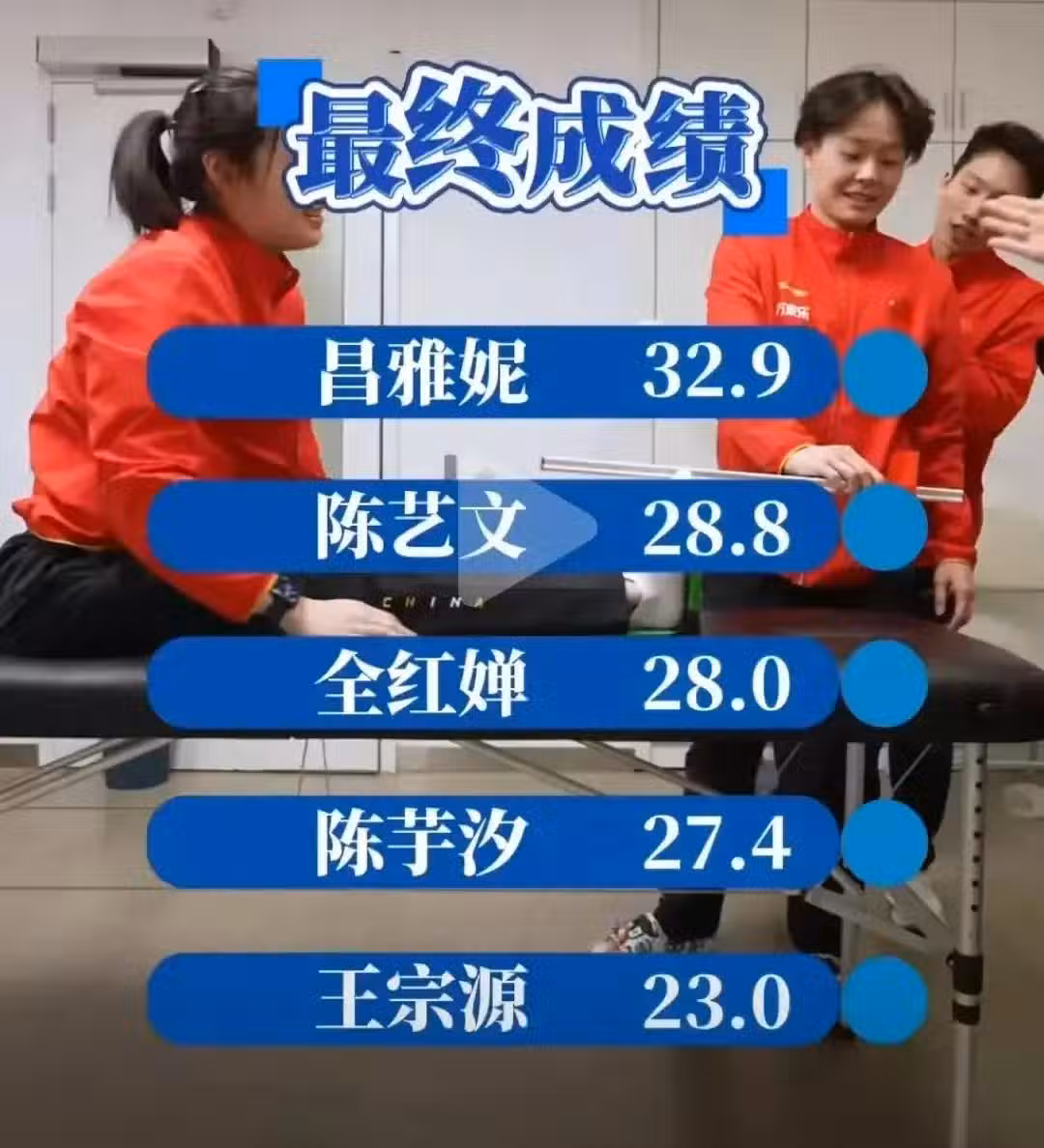 最震撼的當屬昌雅妮,一出手直接飆到32.9厘米,比第二名多出4.1厘米,斷層奪冠!教練透露,柔韌度每提升1厘米,動作完成度可增加3%,昌雅妮的逆天數據正是她招牌動作109C(向前翻騰四周半抱膝)的制勝法寶。
