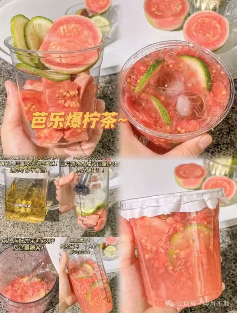 9️⃣寶子們🥰,夏日特調芭樂爆檸茶來咯! 先用熱水泡茉莉花茶,加冰鎖香。芭樂切塊,與香水檸檬、冰塊一起爆錘。倒入泡好的花茶和糖漿,瘋狂搖晃。粉粉嫩嫩的一杯,果香茶香交融,清爽又解膩,一口就愛上,快來試試~