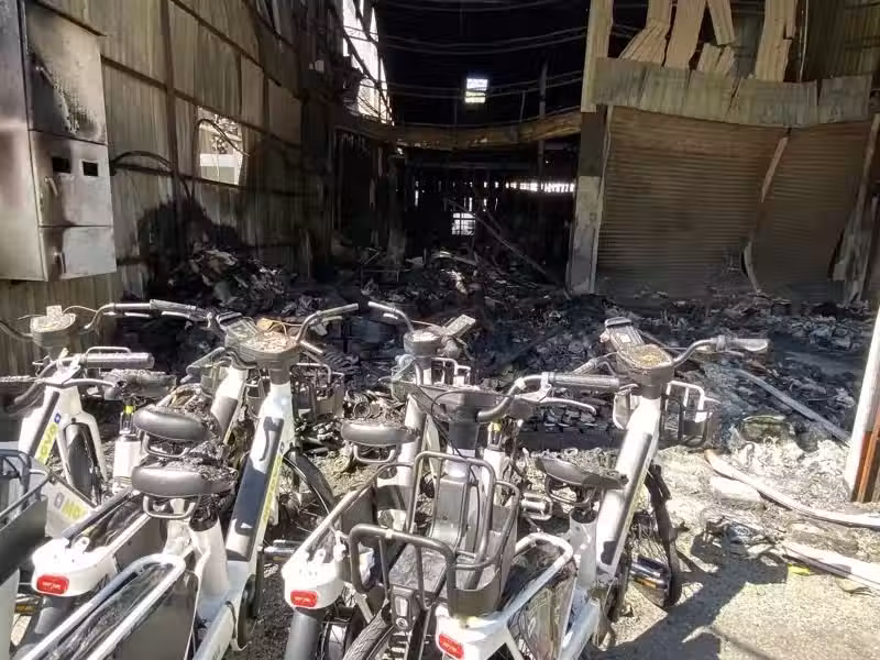 員林市中山路MOOVO自行車檢修區運點倉庫今天凌晨發生大火,倉庫內的自行車和鋰電池都被燒毀。記者林宛諭/攝影