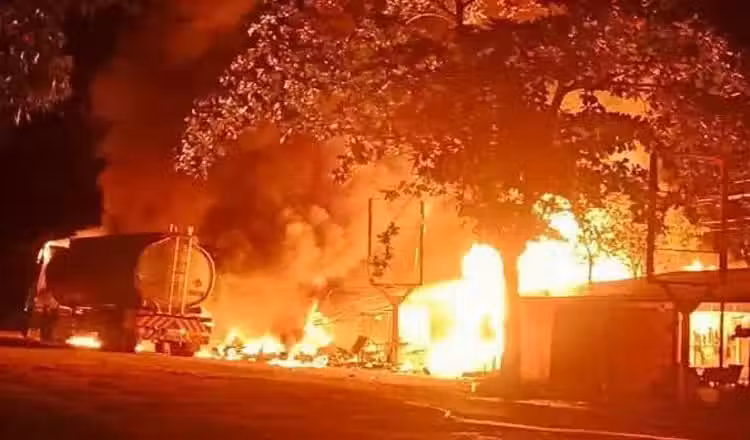 (金邊8日綜合電)一名油槽車司機深夜在屋外非法售賣汽油,其妻子在屋前起火燒烤,疑火花飛濺引燃泄漏的汽油,迅速將油槽車引爆,大火瞬間蔓延,將屋內3名孩子活活燒死。