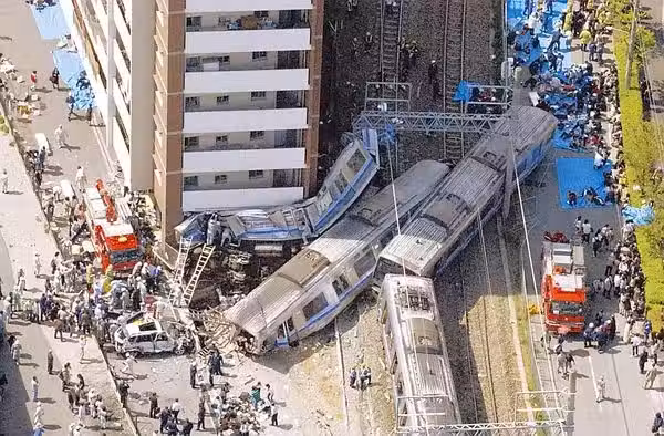 事故發生當天,一列編號5418M的列車在駛入彎道時,以遠超過限速70公里的時速116公里狂飆,導致前5節車廂脫離軌道,其中2節車廂更是直接衝撞附近的公寓建築。這起慘劇的背後原因相當複雜,涉及人為與制度問題。當時那名僅有11個月資歷的駕駛員,在事故前已因誤停月台而受到處分,加上公司實施嚴厲的「日勤教育」懲戒制度,讓他承受極大心理壓力,為了不讓列車誤點他選擇冒險超速。