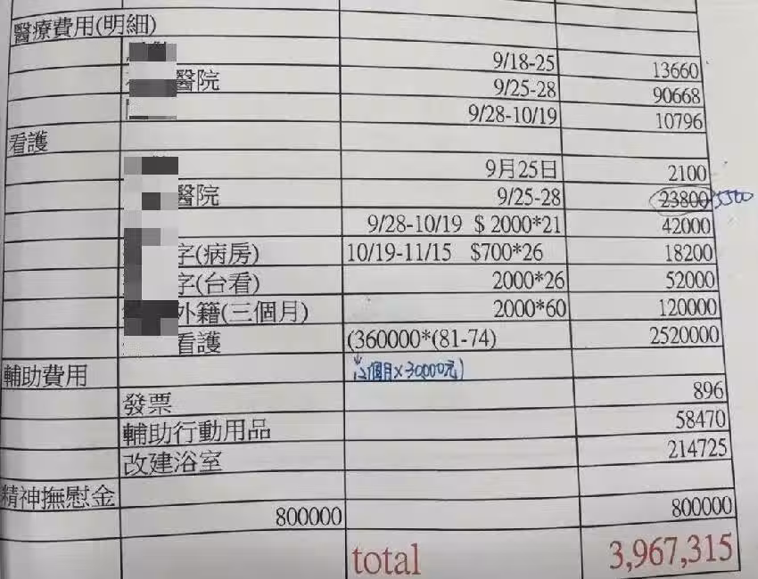 全部加起來居然要1096萬元,他也傻眼表示,當時原本要趕快送醫,結果家屬堅持要送到比較遠的某間醫院,結果導致延誤送醫,但是這個部分對方居然要算在他頭上,讓駕駛很無奈,期間更有里長揚言「要撂人來處理」,讓她身心俱疲。