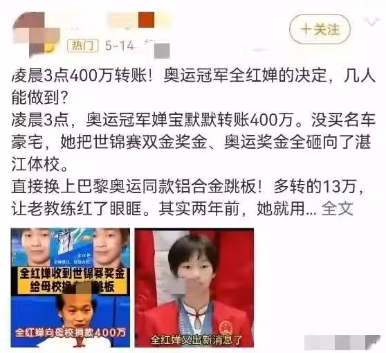 其實這起事件明眼人都能看出來是假的,全紅嬋確實很優秀,但是她沒有那麼大的能力,一下子拿出400萬的。雖然她是奧運會冠軍,但是她一個月才小几千塊錢工資,廣告代言的錢都是單位的,繳完稅後到她手裡沒幾個錢。400萬,不是她不捨得,而是她沒有。自己都沒有了,家裡也沒有,她拿什麼出這個錢呢?