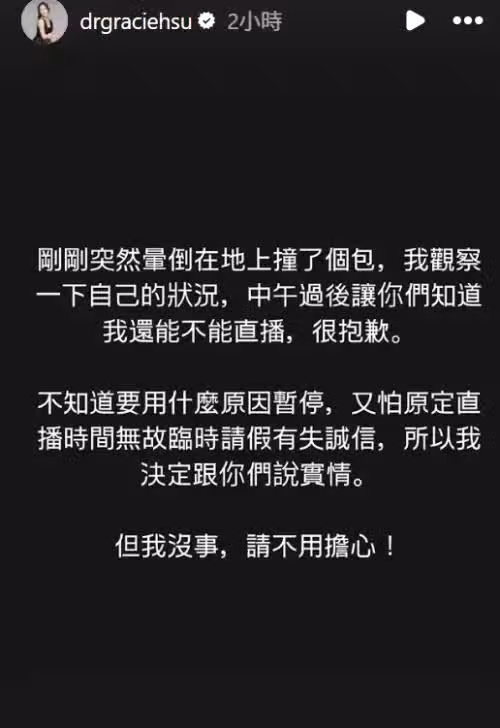 有「最美性學博士」封號的許藍方,4月下旬才剛在社群公開自己動腦部動脈瘤手術的病況,她說因為暈倒緣故才知腦部病變,讓粉絲相當憂心。怎料動完手術不到一個月,今(18)日一早許藍方又在IG限時動態發文,表示自己在家中再度暈倒,倒在地上頭撞了個包,因此晚間很可能需要取消原定的直播,但她同時暖心安慰粉絲:「我沒事,請不用擔心」。