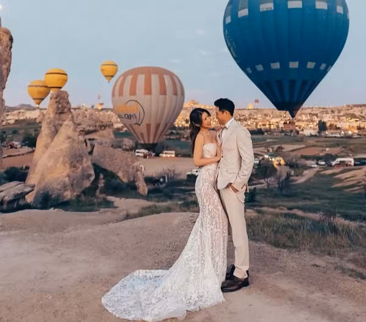 隨著婚紗照的公開,陳婉衡老公的模樣也正式曝光。他穿著經典的米白色西裝套裝,看上去文質彬彬。