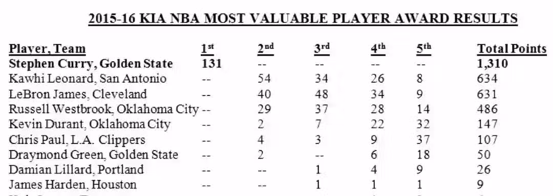 2015-16賽季庫里得到了全部的131張第一選票,成為常規賽歷史上首位(也是至今唯一一位)全票當選MVP的球員!提起庫里我們都會想起他創造的無數與三分相關的紀錄,但是從如今聯盟的比賽風格來說,庫里所創造的三分紀錄不是沒有機會被擊破,反而是2015-16賽季的全票MVP要成為庫里、乃至NBA聯盟最難被打破的紀錄之一!當今聯盟球星扎堆,導致聯盟強弱明顯,但是這樣也就會導致單核球隊難以取得好成績,就算打出再好的數據沒有戰績支撐,也是難以獲得MVP,而球星扎堆的球隊戰績有保證,但是個人數據就會被分散,這是無論如何都無法解決的衝突,除非聯盟改變規則,否則在這個抱團時代,想要再次出現一位全票MVP幾乎不可能。你們認為呢?歡迎留言討論!