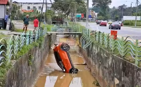 (芙蓉21日訊)芙蓉敦依斯邁醫生路的加德士(Caltex)油站前方三岔路口今午發生車禍,一輛國產Axia轎車疑在閃避過程中撞毀欄杆,整輛車沖入溝渠,熱心民眾挺力相助,及時救出女司機!