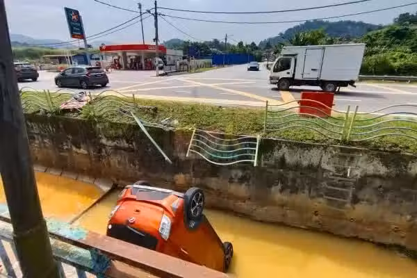 Axia轎車在Caltex油站前方三岔路口處撞毀欄杆,沖入溝渠。
