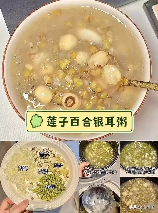 做法:綠豆泡一晚→加2倍水煮40分鐘(滴檸檬汁防變色)→加銀耳百合煮10分鐘。